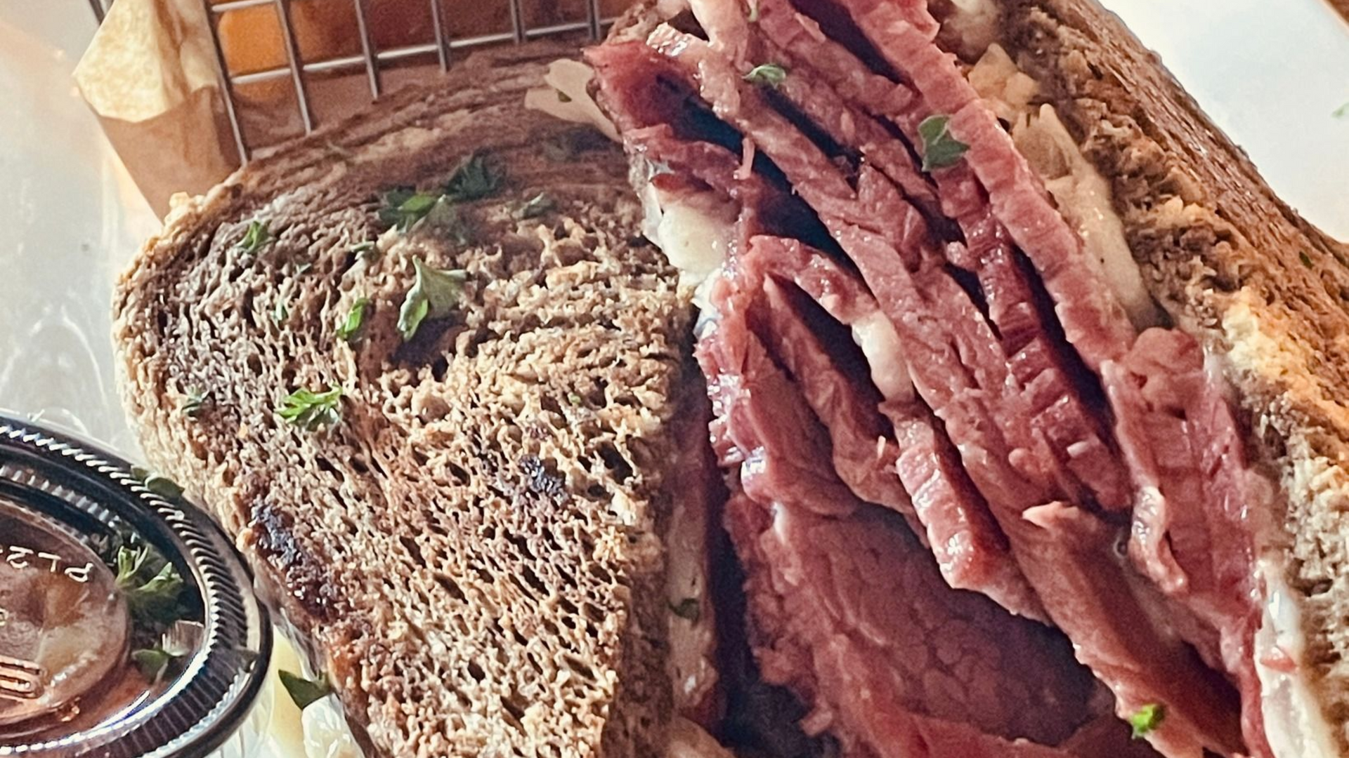 Ultra-tender sous vide corned beef piled high on butter toasted, thick-cut marbled rye with sauerkraut, melted Swiss, and Thousand Island dressing. Served with house-made potato chips.